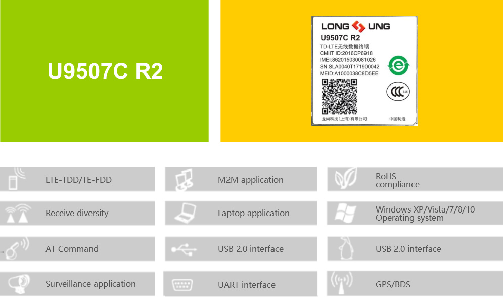 U9507C R2 MGMX 是龙尚科技推出的 LTE Cat4 无线通信模块,内置丰富的网络协议,集成多个标准接口;可以工作在 LTE-TDD/LTE-FDD/UMTS/EDGE/GPRS/GSM 等多种制式。